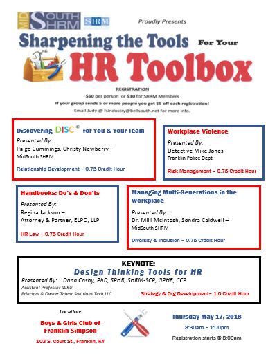 This workshop includes four training sessions: 1) Discovering DISC for you and Your Team - Presented by Paige Cummings and Christy Newberry of MidSouth SHRM; 2) Workplace Violence - Presented by Detective Mike Jones of the Franklin Police Department; 3) Handbooks: Do's & Don'ts - Presented by Regina Jackson, Attorney and Partner, ELPO, LLP and 4) Managing Multi-Generations in the Workplace - Presented by Dr. Milli McIntosh and Sondra Caldwell of Midsouth SHRM.